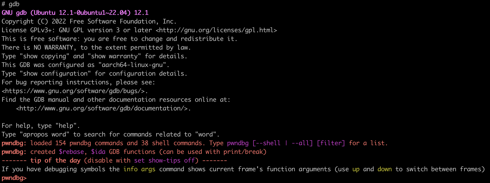 이 명령어를 통해 정상적으로 pwndbg가 설치/실행됨음을 알 수 있다.