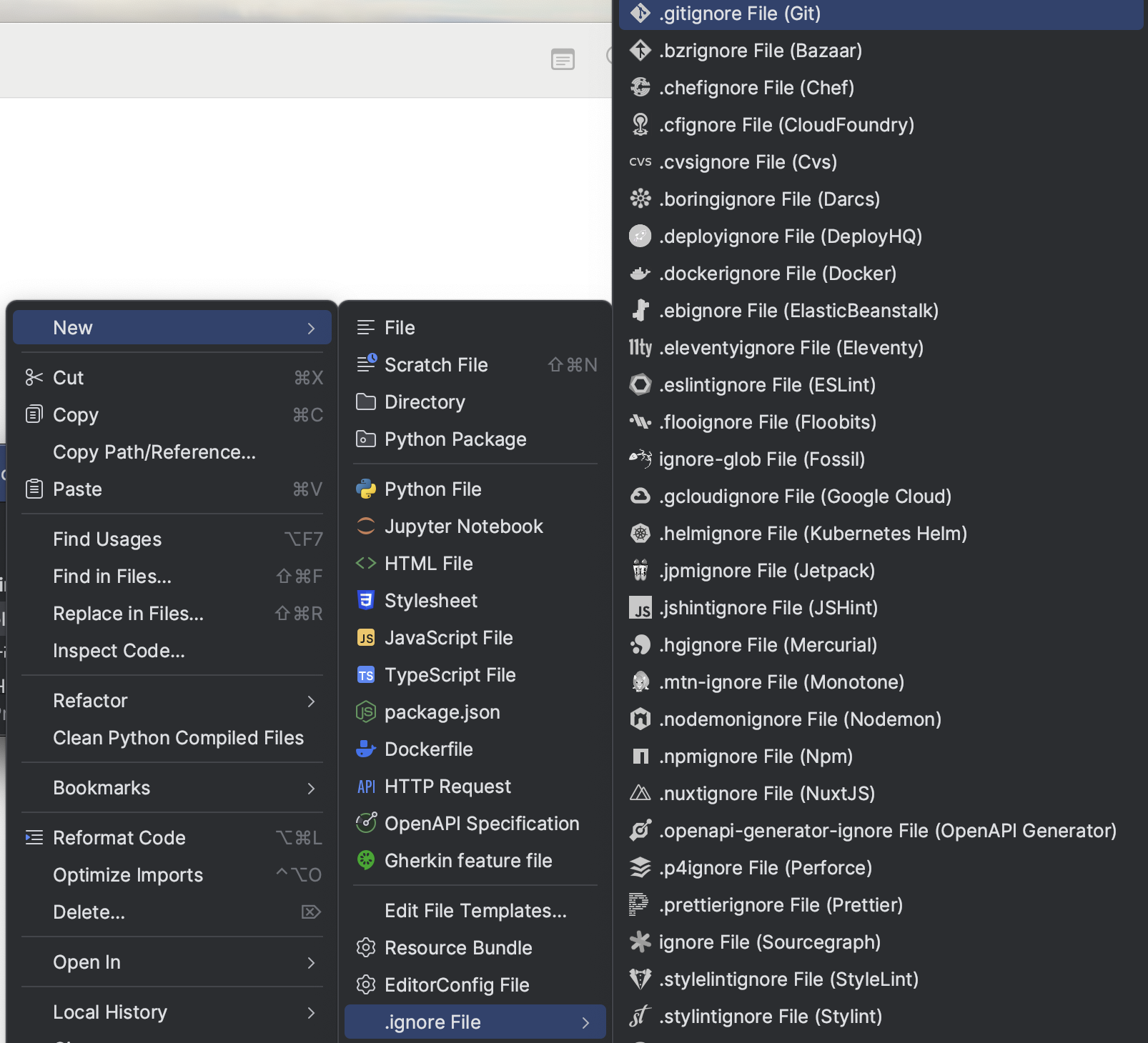 > 디렉토리 우클릭 > new > .ignore > .gitignore을 선택한다