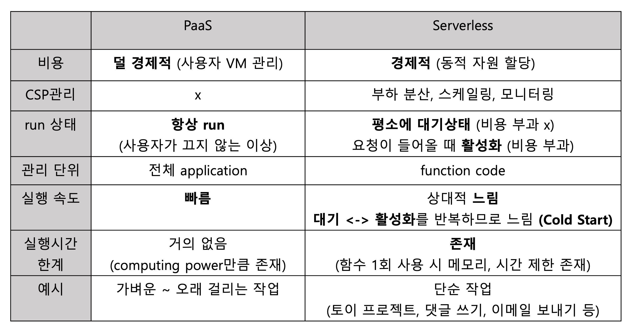 Serverless는 CSP의 서버 관리 서비스(스케일링, 업데이트, 백업 등)가 포함된다.