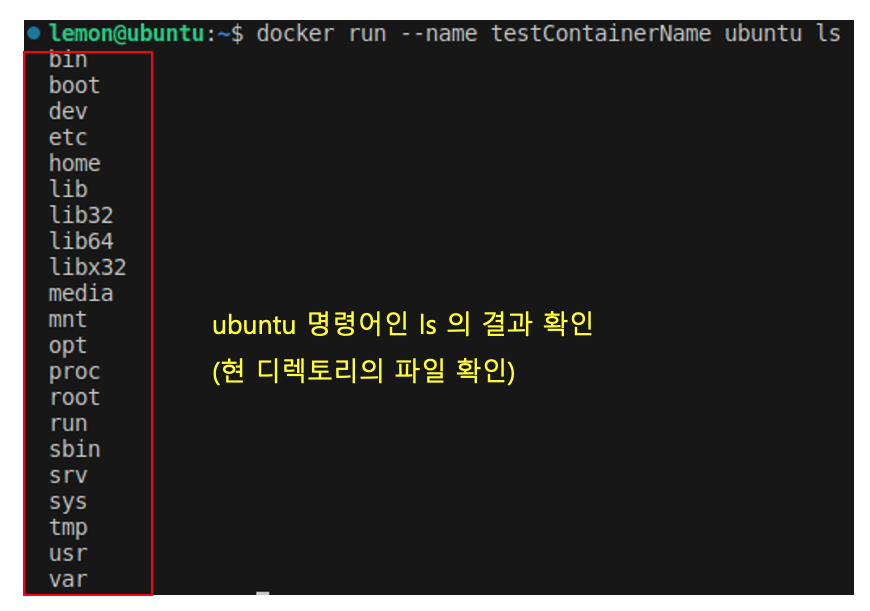 ls: (생성될) 컨테이너에 ls 명령어를 실행시킴