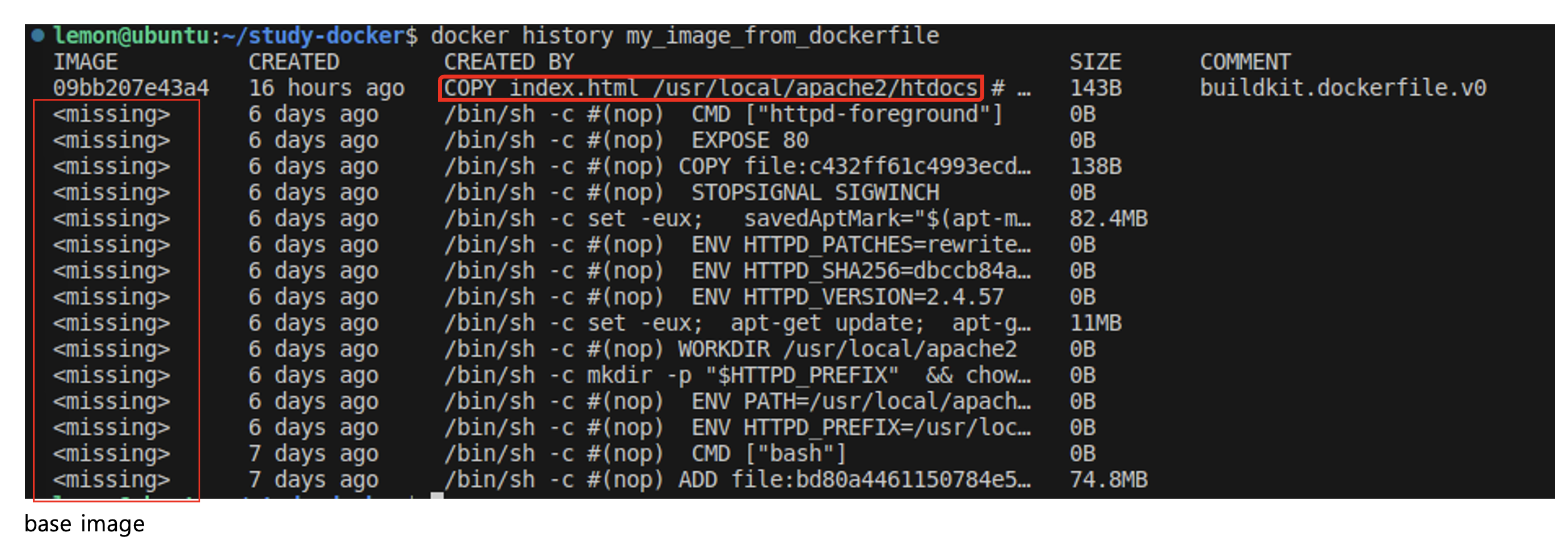 이 경우, COPY 명령어로 host 컴퓨터의 파일을 컨테이너로 전송한 이력이 남는다
