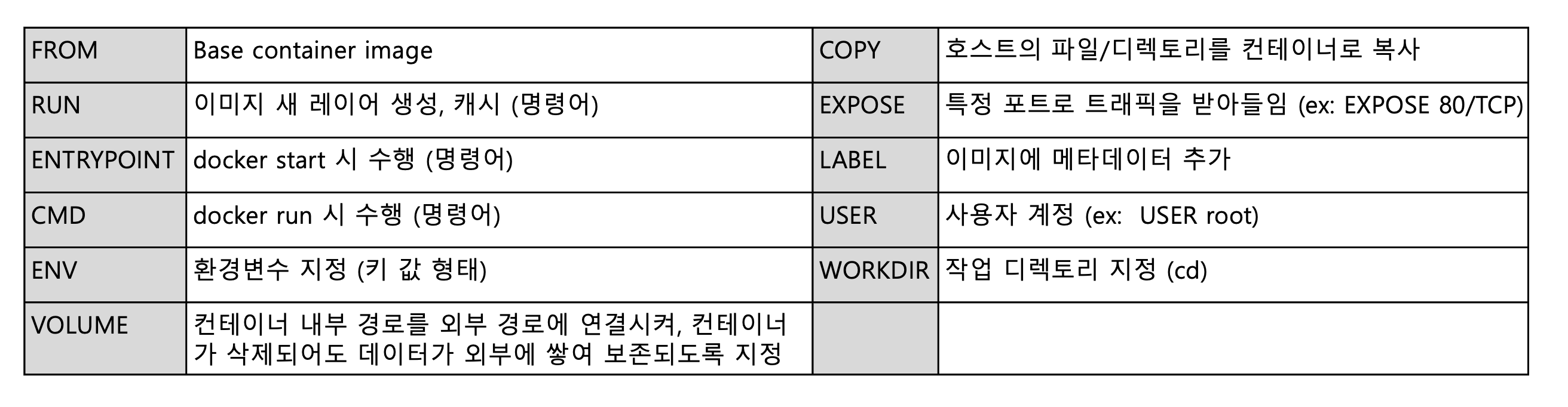 - 컨테이너의 구성 정보(기본 이미지, 패키지, 추가할 소스코드, 실행할 명령어 등)를 하나의 파일로 기록