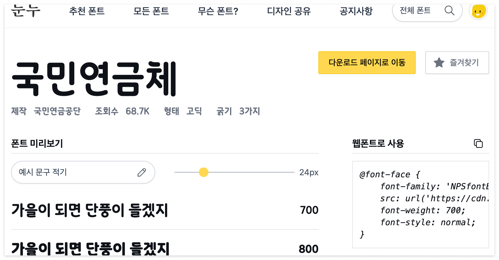 - 웹폰트 사용 쉬움 (코드 복사 가능) !!!!!! (css에 적용할 때에는 주로 이 사이트 이용)