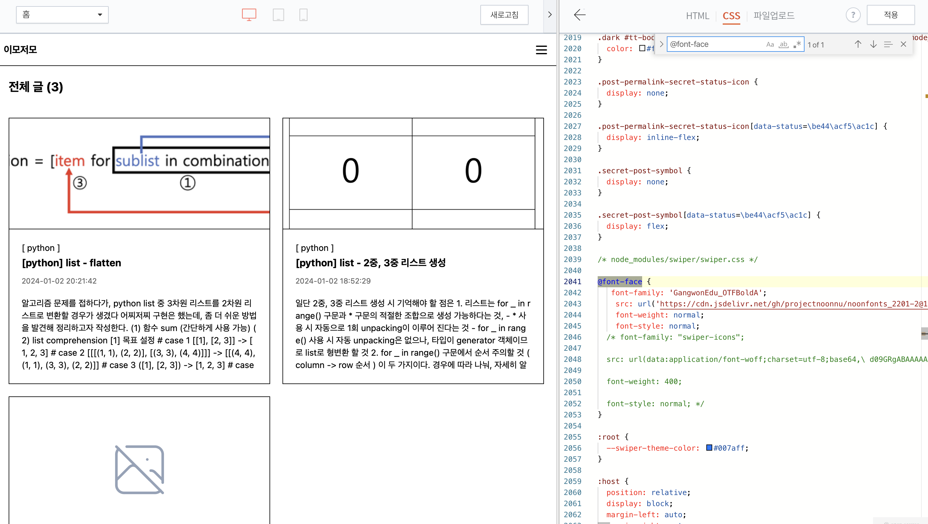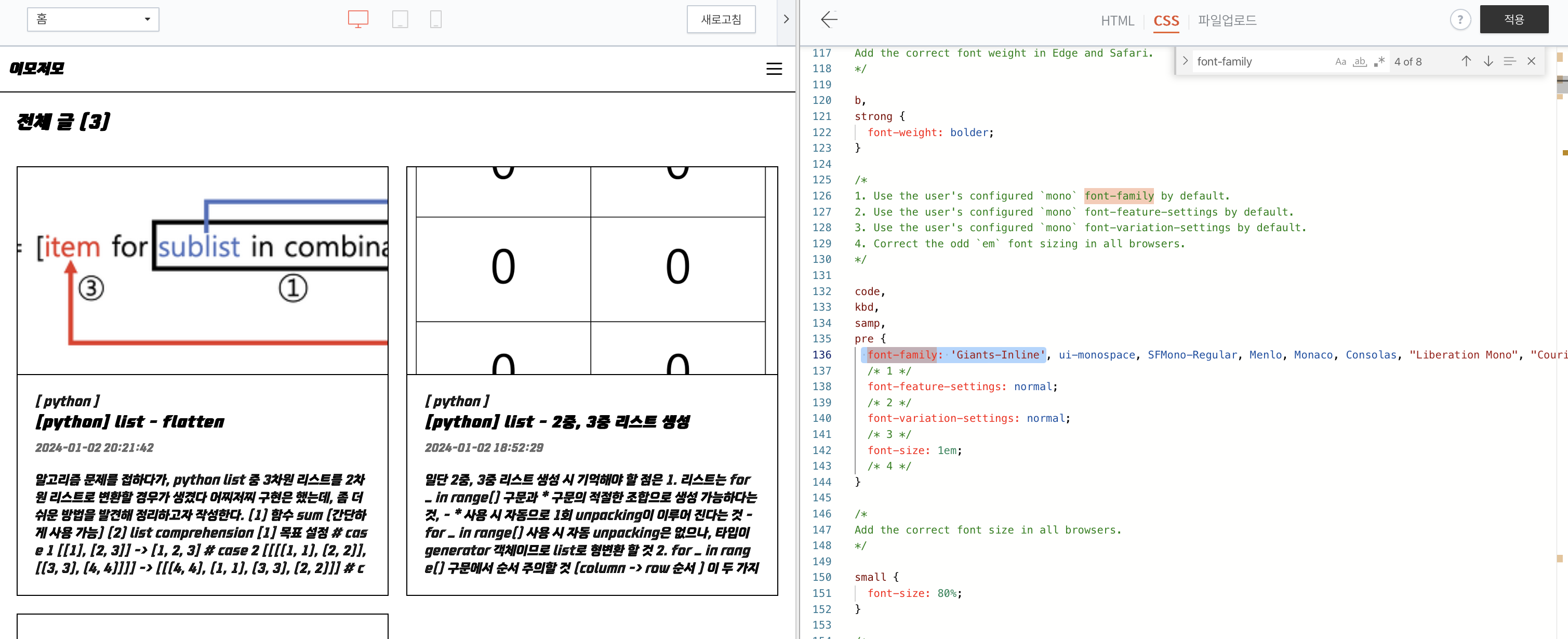 7. 계속해서 [command/ctrl + f] 키를 이용해 'font-family'를 찾아서 수정