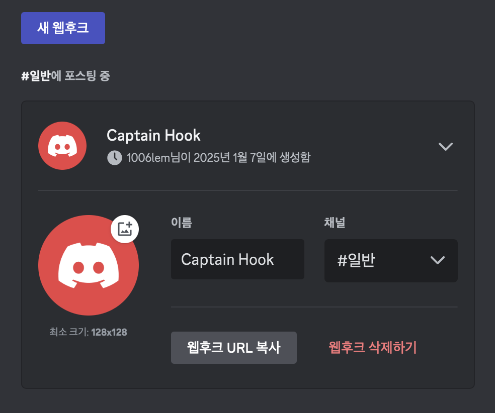 - 웹 후크 생성 후, URL을 메모장에 저장해두자!